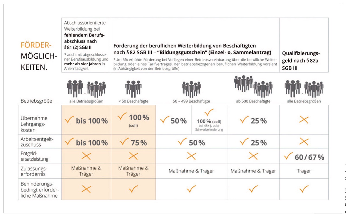 Fördermöglichkeiten, die Arbeitgeber im Bereich der Weiterbildung von Beschäftigten bei der Agentur für Arbeit haben.