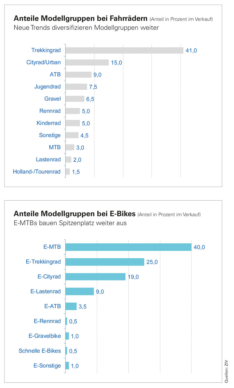 Der Rückgang in der Statistik könnte auf den ersten Blick damit zusammenhängen, dass die Kategorien neu strukturiert wurden. Insbesondere die Online-Anteile sind nun klarer zuzuordnen. Unter den 20 Prozent »Fachhandel/-markt online« sind nicht nur die Online-Umsätze der stationären Händler zugeordnet (3 Prozent Anteil in 2023), sondern auch die Online-Spezialisten mit Fahrradfokus.