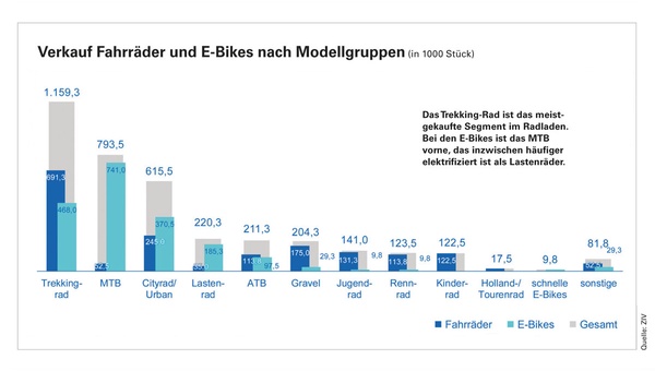 und sogar 137.500 Gravelbikes (117.000 ohne Motor). Nur in den Kategorien City und Trekking gibt es halbwegs ausgewogene Verkaufszahlen mit und ohne Motorisierung, sonst wird klar eine Variante bevorzugt.