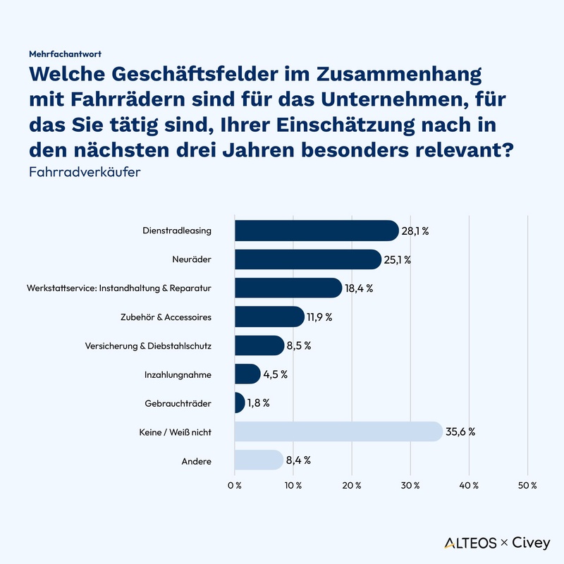 In der Studie kamen zudem die relevantesten Geschäftsfelder der nächsten drei Jahre zur Sprache. 28,4 Prozent nannten hier Dienstrad-Leasing, 25,5 Prozent Neuräder und 19,8 Prozent Instandhaltung und Reparatur. Zubehör und Accessoires sind für 13,2 Prozent und das Geschäftsfeld Versicherung und Diebstahlschutz für 9,5 Prozent wichtig. Mehr als ein Drittel der Verkäufer gab zudem an, unsicher zu sein, welche Geschäftsfelder in den kommenden Jahren an Bedeutung gewinnen werden.