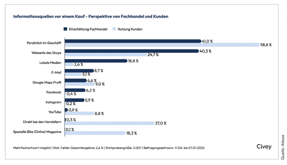 Studie befragten Fachhändler die Herstellerwebseiten sowie die Special-Interest-Magazine als irrelevant im Kaufprozess betrachteten, spielen sie für die Kundschaft eine große Rolle. Umgekehrt überschätzt der stationäre Handel die Bedeutung von lokalen Medien und seiner eigenen Webseite. Während er Social Media Beachtung schenkt, beeinflussen Facebook und Instagram, zumindest in der Selbstwahrnehmung der Kundschaft, ihre Kaufabsichten nicht.