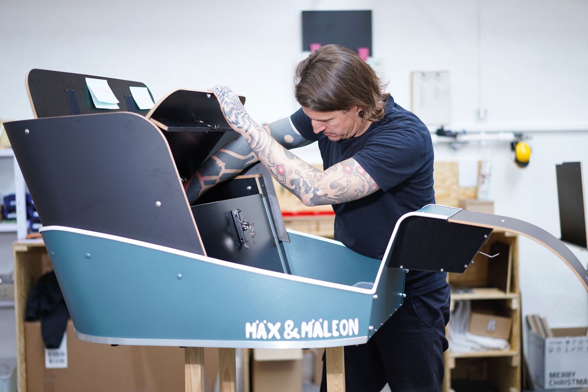 Franziska, Emanuel und Andreas waren begeistert. So sehr, dass sie beschlossen ihre Jobs zu kündigten, um Mäx & Mäleon zu gründen. Der Name, abgeleitet von Chamäleon, ist eine Anspielung auf die Wandlungsfähigkeit des Bikes. Das Stausystem ist variabel und kann auf jede erdenkliche Nutzung angepasst werden. Auch Spezialaufbauten für die gewerbliche Nutzung sind möglich. Für mobile Kaffeetheken oder Handwerker-Services. Das Trio beantragte Start-up-Förderung und besuchte Firmengründungs-Seminare. Im März 2022 wurde das erste Serienexemplar ausgeliefert. Seitdem ist nichts mehr, wie es vorher war. Die Firma wächst und wächst. Unzähliges muss koordiniert und organisiert werden. Im Moment sind sie zu zehnt. Was die größte Herausforderung ist? Emanuel überlegt. »Alles«, antwortet er schließlich und grinst.