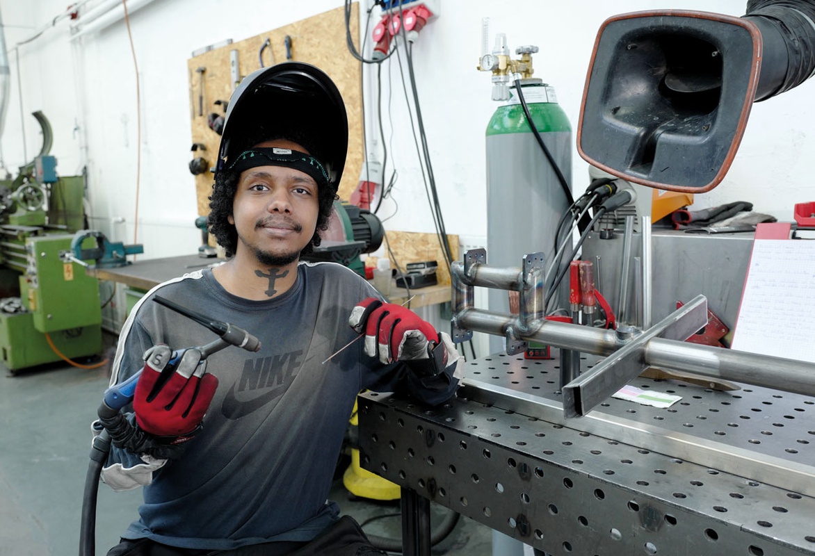 Es gibt viele Cargobikes. Auch mit drei Rädern und Frontladefläche. Das Konzept von Mäx & Mäleon aber ist anders und umfassender als das von anderen Herstellern. Obwohl die Serienfertigung erst vor Kurzem angelaufen ist, hat Mäx & Mäleon schon viele Preise gewonnen. Unter anderem den »Schwarzen Löwen 2024«, den Gründerpreis von Baden-Württemberg. Wirklich sichtbar ist die Marke auf den Straßen aber noch nicht. Die aktuellen Produktionskapazitäten lassen nur 18 Bikes pro Monat zu. Der mittelfristige Plan ist allerdings, den Output auf 1000 Bikes im Jahr zu steigern. Auch das Firmengebäude entzieht sich zunächst dem Blick. Die Produktionshalle befindet sich in dritter Gebäudereihe. Wer zum ersten Mal hier ist, hat Schwierigkeiten, sie zu finden. Keine Leuchtreklame, keine prangenden Logos. Eine Art Lagerbereich ist der Eingang. Dahinter befindet sich die Rahmenfertigung. Drehbänke, Rohre, ein Regal mit Frästeilen. Die grellen Lichtblitze einer Schweißnadel zucken ins Neonlicht. Es riecht nach verbranntem Metall. Die Montagehalle befindet sich nebenan. Im winzigen Zwischenraum steht ein Ikea-Regal. Jedes Fach ist mit dem Namen eines Mitarbeiters beschriftet. Auch die Namen von Franziska, Emanuel und Andreas stehen auf den Schildchen.