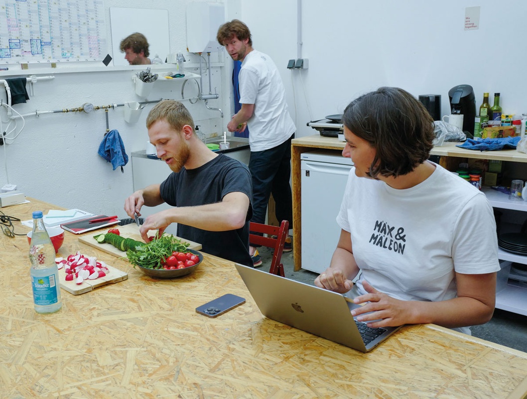 »Es war unser Ziel, eine Firma frei von Hierarchien und mit hoher Wertschöpfungstiefe aufzubauen, die trotzdem wirtschaftlich ist«, fasst Franziska die Idee von Mäx & Mäleon zusammen. Klimarettung, Mobilitätswende und nun auch noch die Perfektionierung der Arbeitswelt? Ist das nicht alles eine Spur zu groß? Hohle Worte sind es jedenfalls nicht. Das wird beim Betreten der Montagehalle klar. Aus einer Musikbox perlt souliger Beat in Cocktailbar-Lautstärke. Alles ist offen und freundlich gestaltet. Ein Hochregal teilt die Halle in Produktion und Bürobereich. Wände im klassischen Sinn gibt es nicht. Der Schreibtisch der Geschäftsführung steht offen im Raum. Daneben ein Sofa. Im angrenzenden Küchenbereich schnipselt ein Mitarbeiter Gurken, Möhren und Tomaten. Auf dem Tisch stehen Brotkörbe und Humus bereit. Emanuel huscht zum Geschirrschrank und holt Teller. Gleich ist Mittagspause. Gekocht und gegessen wird fast immer zusammen. Die Szenerie erinnert mehr an eine Biker-WG als an eine Fahrradproduktion.