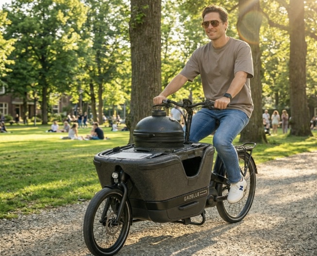 Den Gegenentwurf zu Chike (siehe oben) liefert der niederländische Hersteller Gazelle mit dem Sondermodell Grill-Chill aus der Makki-Lastenrad-Reihe. Ein Traumgefährt für den Grillheld, der nicht auf den heimischen Garten beschränkt sein will. Dass die aktuelle Grillfleisch-Temperatur direkt auf dem Display am Lenker abgelesen werden kann, versteht sich ja von selbst. Weitere Einzelheiten zeigt Gazelle auf dem