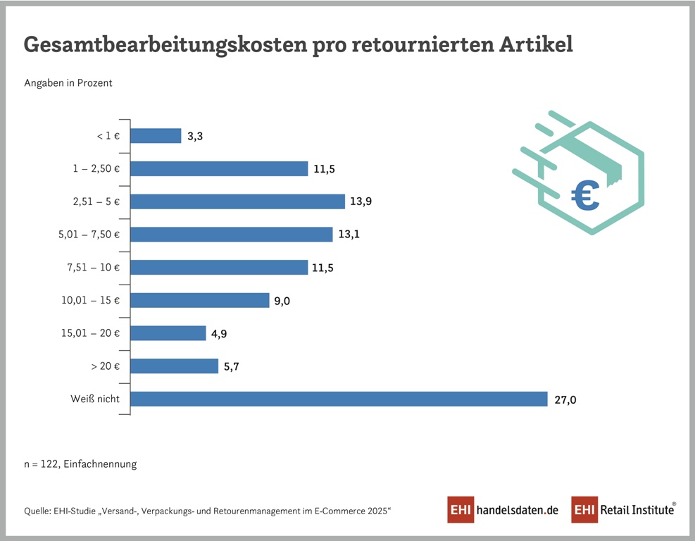 Die Bearbeitungskosten bewegen sich bei den meisten Unternehmen im mittleren einstelligen Eurobereich. Über die Hälfte der Händler (53,3 Prozent) geben die Kosten pro retourniertem Artikel mit bis zu 10 Euro an. Weitere 13,9 Prozent kalkulieren mit bis zu 20 Euro. Bei vielen Händlern erschwert die fehlende Kostentransparenz gezielte Optimierungen. So können 27 Prozent ihre Bearbeitungskosten gar nicht konkret beziffern.