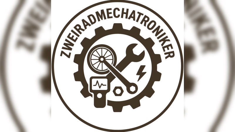 Ein Laufrad, ein Maulschlüssel und ein stilisierter elektrischer Impuls stehen für Mechanik, Elektronik und Diagnosetechnik – die Kernkompetenzen des Zweiradmechatroniker-Handwerks. Eingefasst ist das Motiv in ein Zahnrad, das für Präzision und technische Fertigung steht.