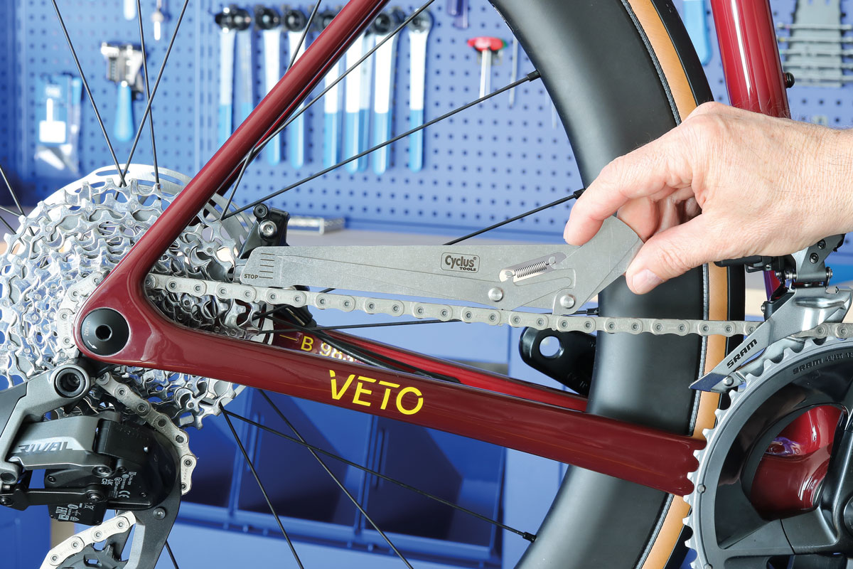 Der Kettenverschleißprüfer misst den Verschleißgrad von Fahrradketten, inklusive Srams AXS Flattop. Zwei Messfühler und ein dritter mit Feder sorgen für konstante Spannung und genaue Ergebnisse. Die integrierte Skala zeigt den optimalen Wechselzeitpunkt an. Bei der Anzeige »Stop« bedeutet dies eine Längung der Kette um 1 Prozent. Die Lieferung erfolgt inklusive Lederetui.